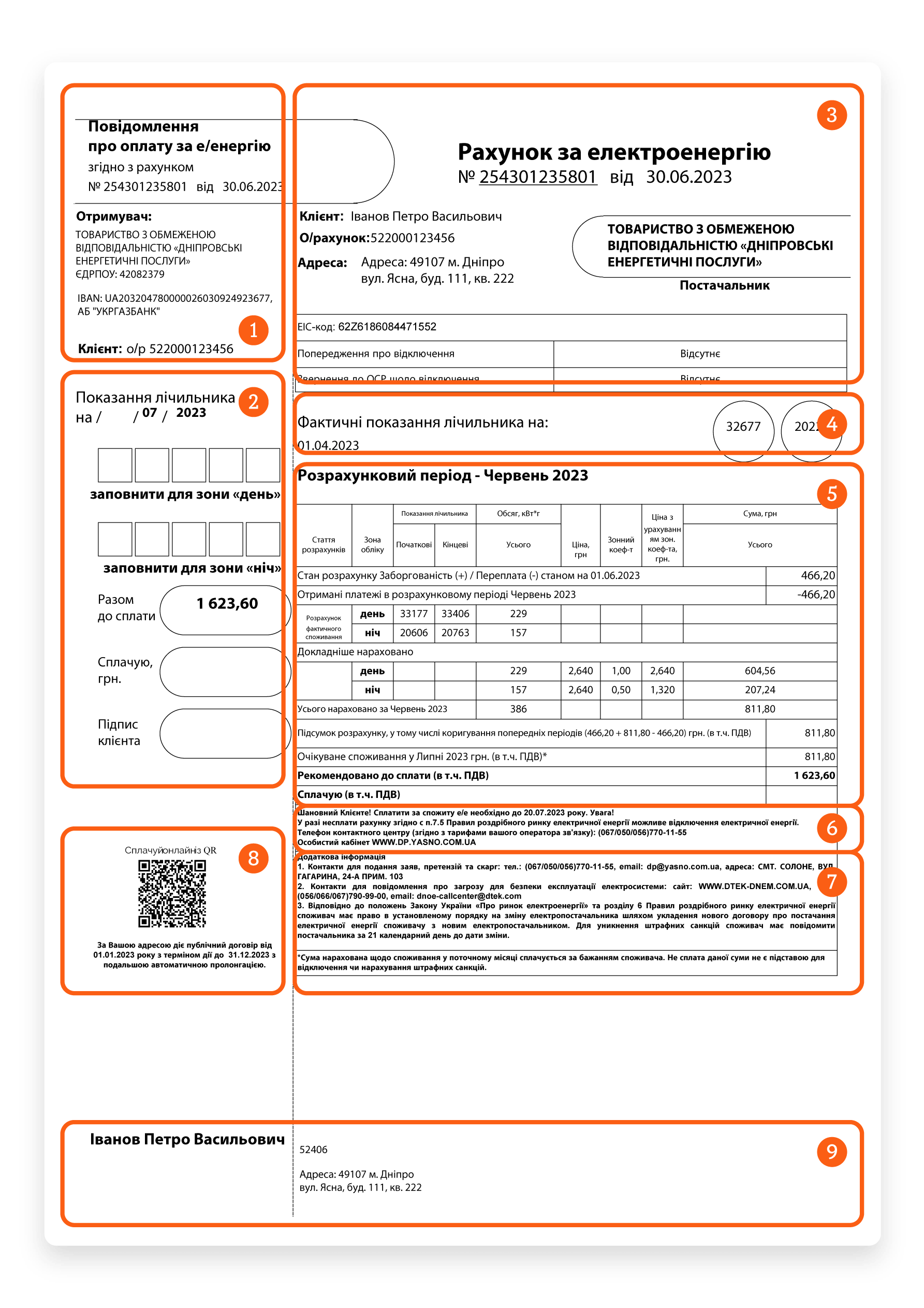 Дані клієнта та постачальника – номер рахунку та дата його формування, банківські реквізити YASNO (ТОВ Дніпровські енергетичні послуги), особовий рахунок клієнта.